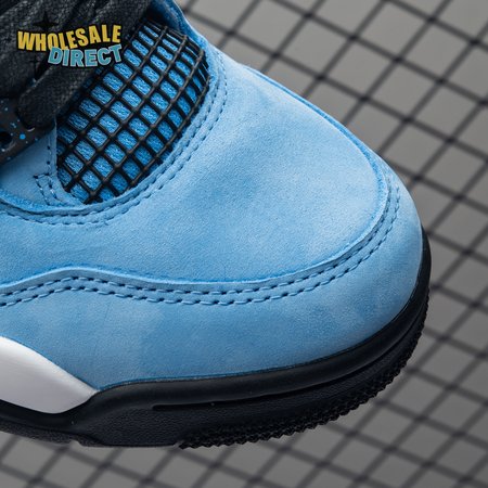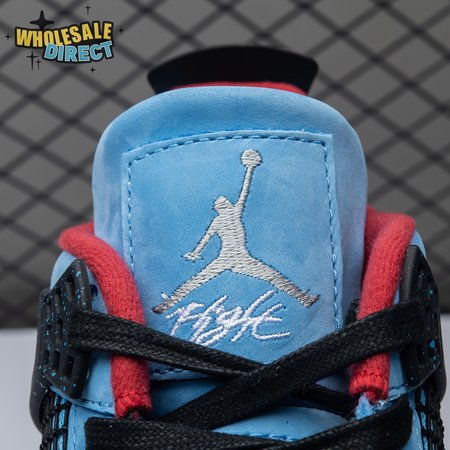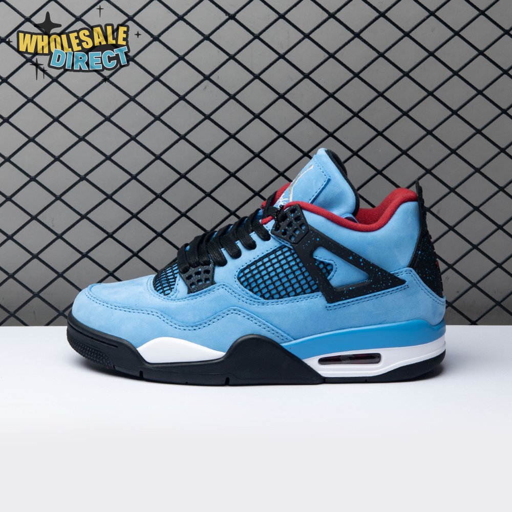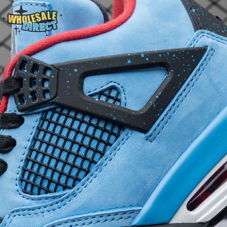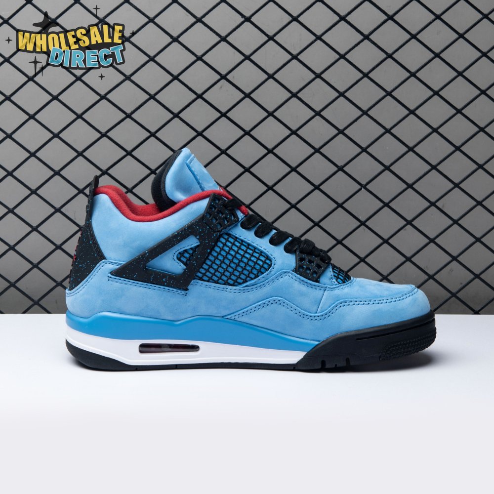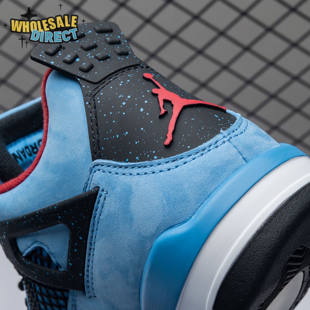 Music artist Travis Scott hails from Houston, where the Oilers used to take the field in red, white and blue uniforms. The Travis Scott x Air Jordan 4 Retro 'Cactus Jack' colorway pays tribute to the city"s bygone football team with a Durabuck leather upper dressed in University Blue and a Varsity Red insole. The black lace cage and a heel panel feature a light blue speckle pattern. Cactus Jack branding appears on the left heel in Varsity Red, with a matching Jumpman logo on the right.