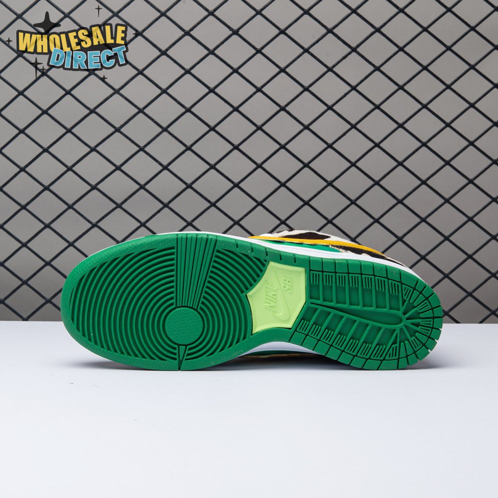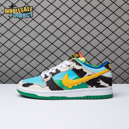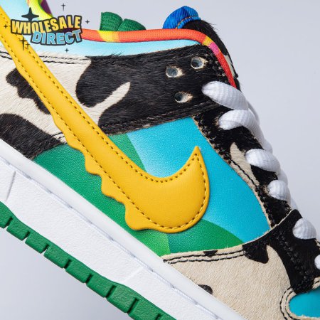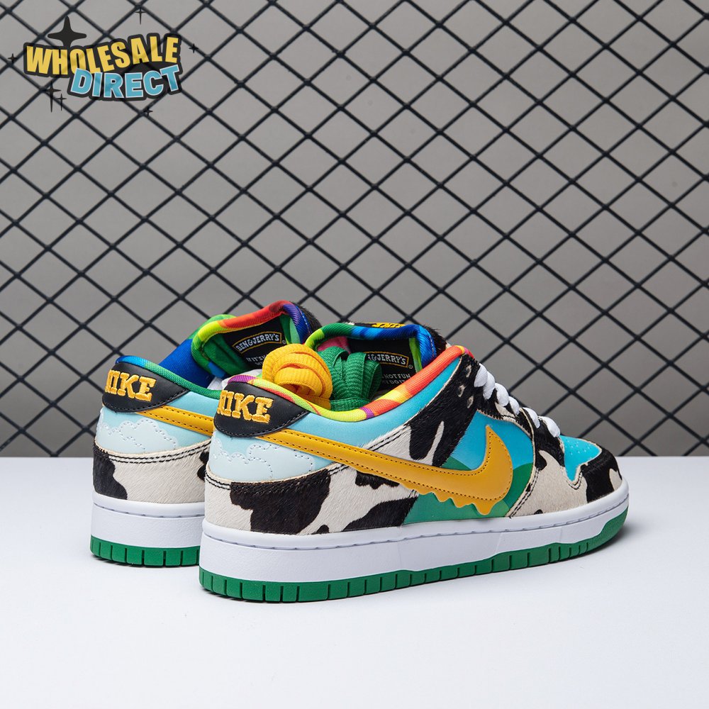 Made in collaboration with Ben & Jerry"s, the Nike Dunk Low SB "Chunky Dunky" replicates the packaging used for the ice cream brand"s Chunky Monkey flavor. The leather upper depicts blue skies and green pastures, while pony-hair overlays are rendered in a spotted cow print. A yellow leather Swoosh is treated to a melting ice cream effect for added visual flair. Atop the tongue, the woven tag features a Chunky Dunky callout alongside Nike SB branding.