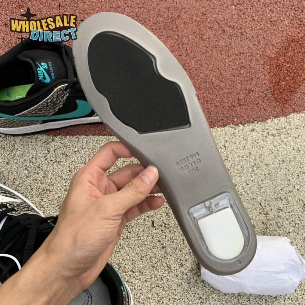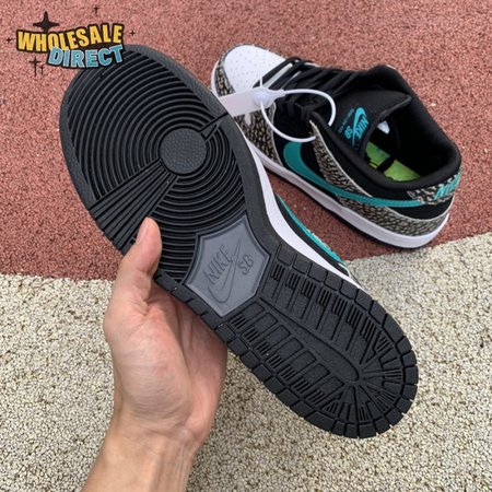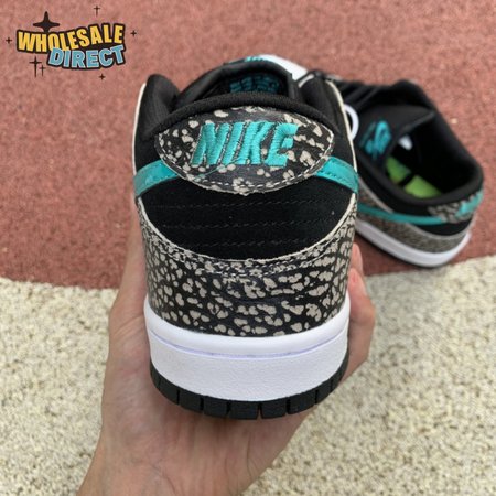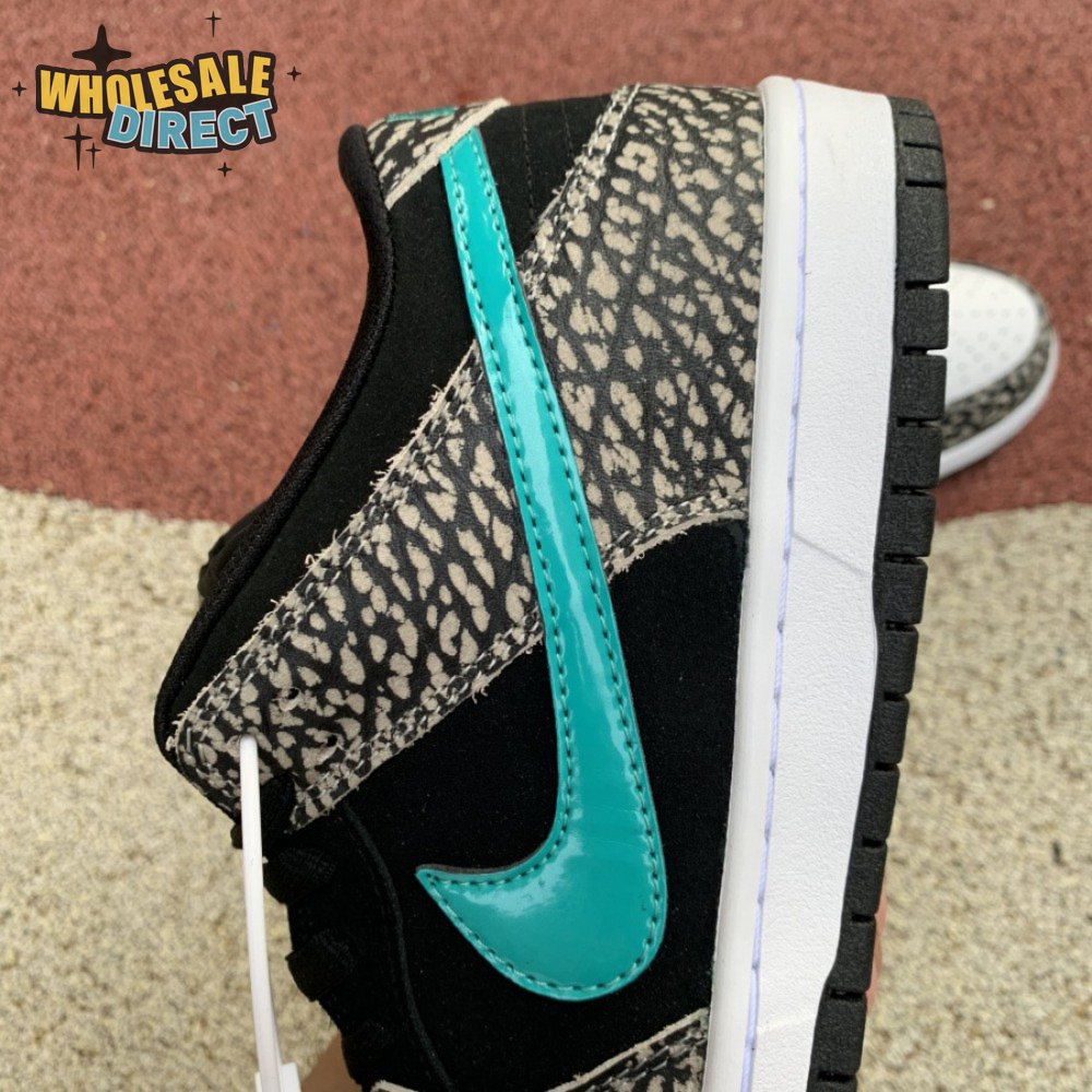 The Nike Dunk Low Pro SB "Atmos Elephant" showcases a familiar design reminiscent of Atmos" highly coveted Air Max 1 collaboration, originally released in 2006 and reissued in 2017. The low-top features a perforated white leather toe box, black suede quarter panel and grey elephant-print overlays along the forefoot and heel. The signature Swoosh stands out in Clear Jade, matching Nike branding hits at the heel tab and woven tongue tag.