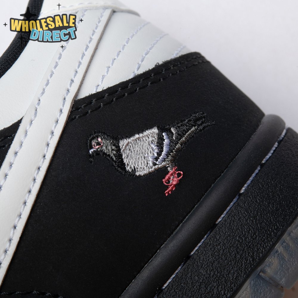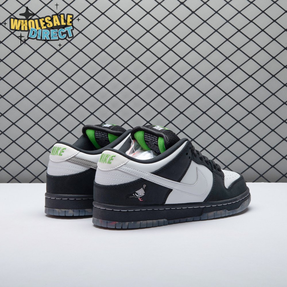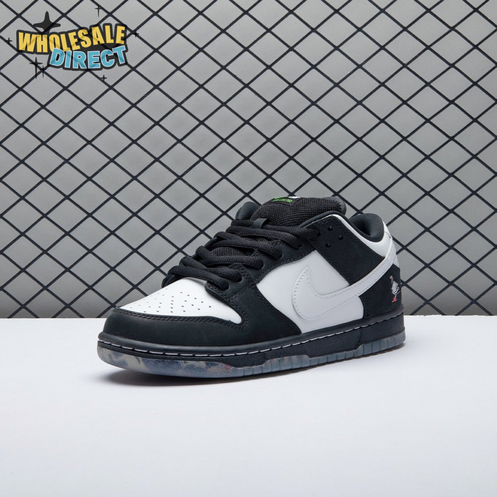 Originally conceived as a sample colorway that was initially rejected, the Jeff Staple x Dunk Low Pro SB "Panda Pigeon" continues Staple"s long-running partnership with Nike SB. The design lives up to its name with a black and white color scheme on the leather and suede upper, complete with the all-important pigeon on the lateral heel. A translucent outsole reveals a collage made up of newspaper headlines alluding to the infamous Pigeon Dunk launch from 2005.