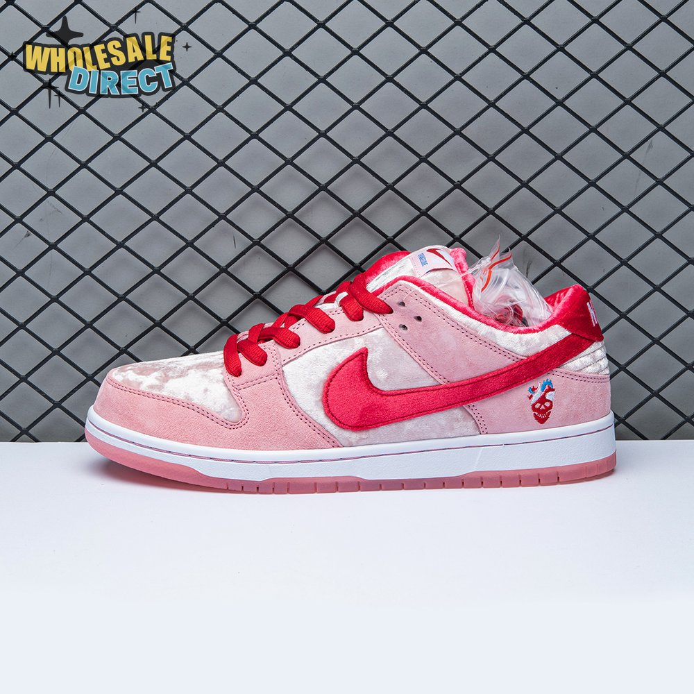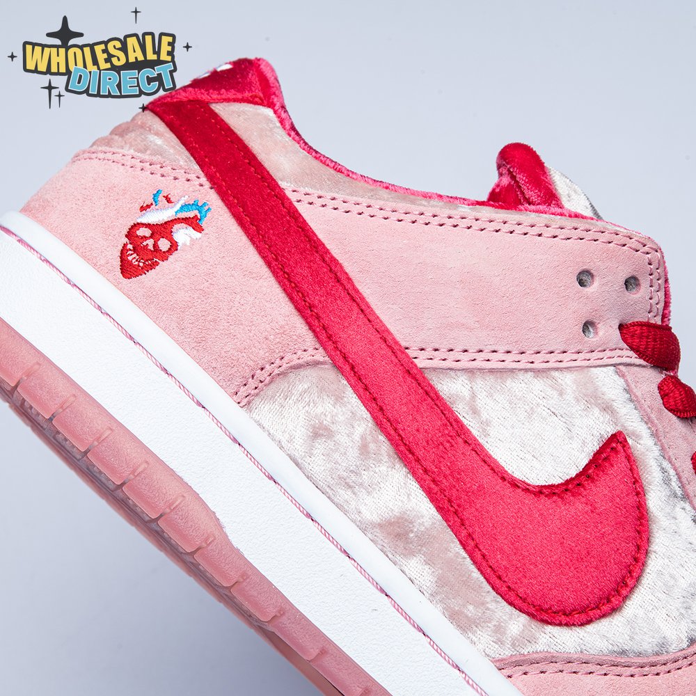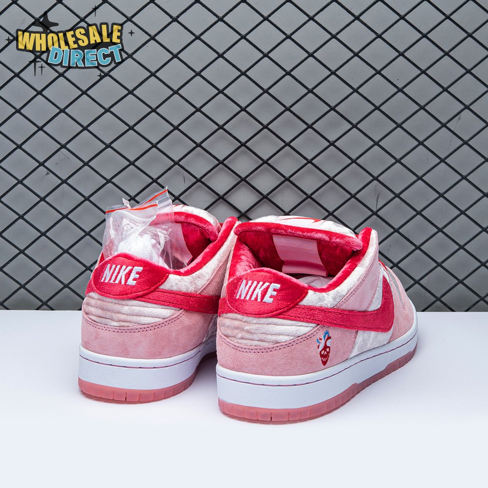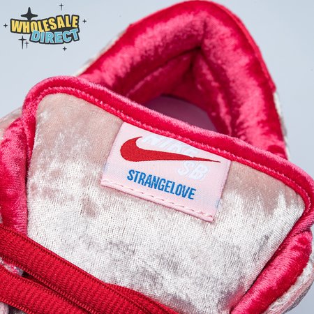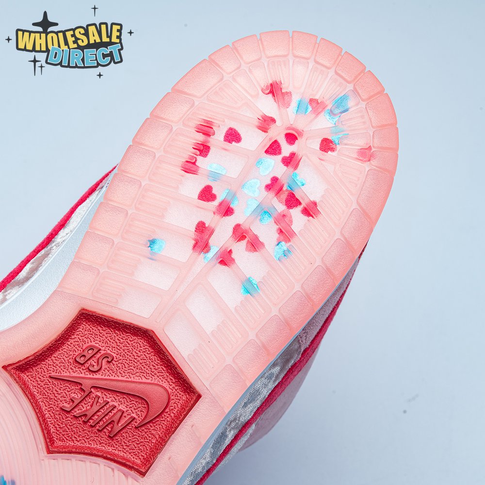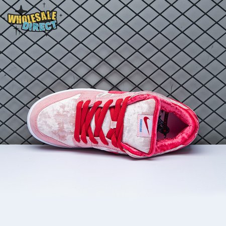Made in collaboration with Sean Cliver"s skate brand, the StrangeLove x Dunk Low SB QS 'Valentine's Day' celebrates the romantic holiday with a plush take on the retro silhouette. The upper is constructed from white crushed velvet with pink suede overlays and a red velvet Swoosh. Cliver"s "Heart Skull" graphic is embroidered on the lateral heel, while the translucent pink rubber outsole reveals an array of scattered hearts in contrasting red and blue tones.