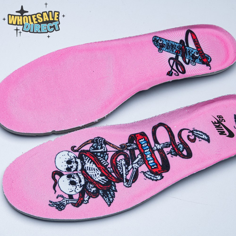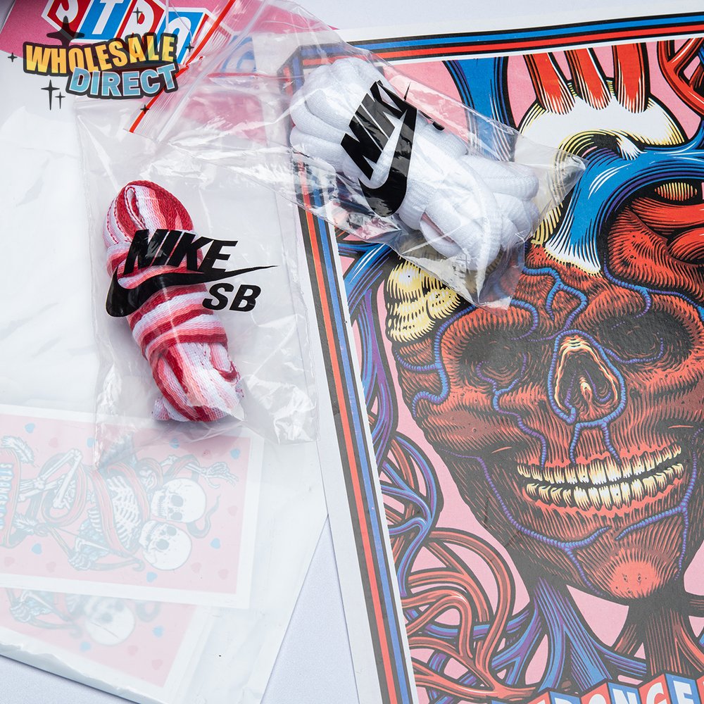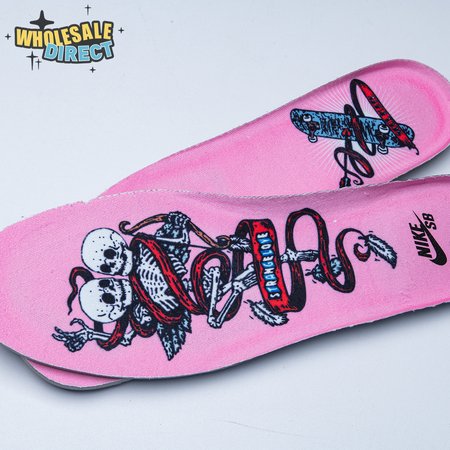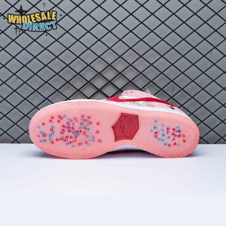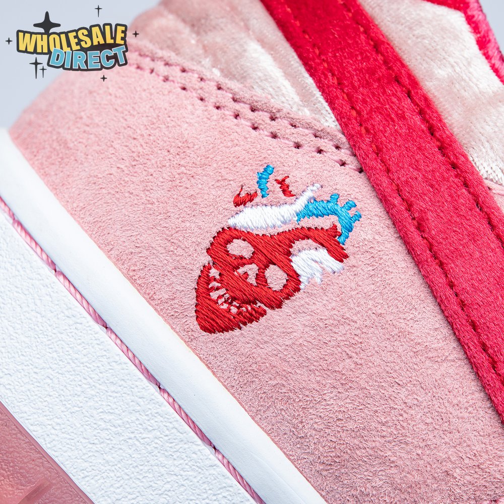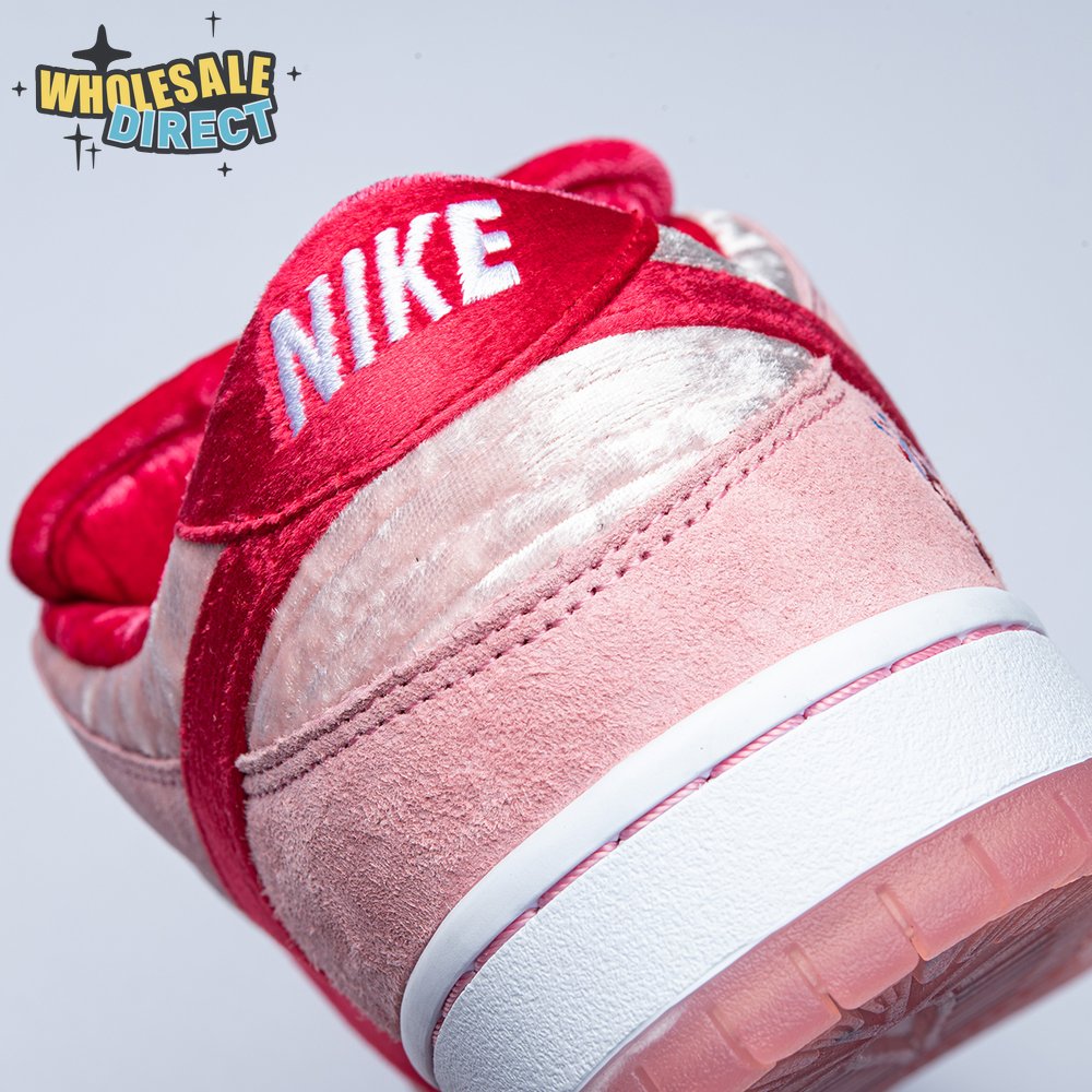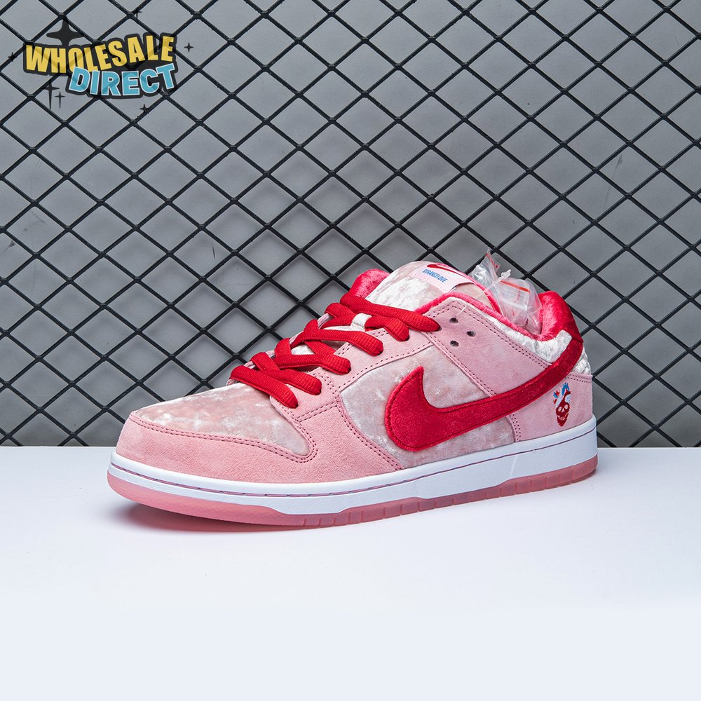 Made in collaboration with Sean Cliver"s skate brand, the StrangeLove x Dunk Low SB QS 'Valentine's Day' celebrates the romantic holiday with a plush take on the retro silhouette. The upper is constructed from white crushed velvet with pink suede overlays and a red velvet Swoosh. Cliver"s "Heart Skull" graphic is embroidered on the lateral heel, while the translucent pink rubber outsole reveals an array of scattered hearts in contrasting red and blue tones.